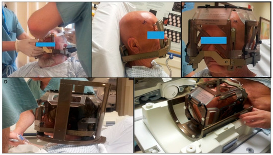 The surgery was done in two stages. In the first stage, we implanted DBS electrodes under local anesthesia using the frame-based stereotactic technique. The patient was instructed to stop all anti-Parkinsonian medications 12 h before surgery to facilitate microelectrode recording (MER), and allow clinical assessment during stimulation. The first step was the application of the Leksell frame Model G (Elekta Instruments, Inc., Atlanta, GA, USA) to the patient’s head (Figure 1).