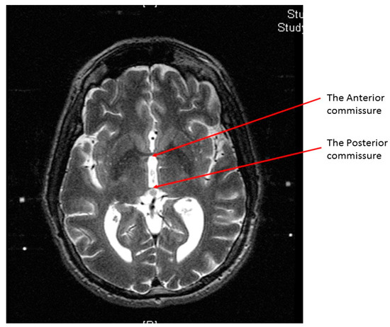 An axial T2 weighted magnetic resonance imaging (MRI) image showing the anterior commissure and the posterior commissure.