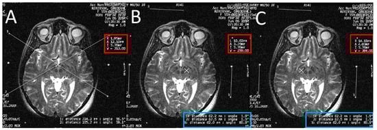 At the end of the scan, we chose an axial T2 image (or two adjacent images) in which both the AC and the PC are seen (Figure 3). With simple arithmetic equations based on the Leksell frame coordinates system, we were able to calculate the stereotactic coordinates of the mid-commissural point (MCP), and the STN directly from the MRI coordinates of the AC and the PC (Figure 4). Based on the known anatomical relationship of the STN to MCP from the previous anatomical studies and stereotactic atlases [36,47,48,49,50,51,52,53,54], we selected the STN target at 12 mm lateral, 3 mm posterior, and 6 mm inferior to the MCP.