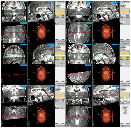 Screen shots from the FrameLink software of the StealthStation showing fused T1 and T2 magnetic resonance imaging (MRI) images of the patient and the planning process with identification of the posterior edge of the anterior commissure (A); the anterior edge of the posterior commissure PC (B); three midline points (C–E); and the final coordinates of the right subthalamic nucleus (F).