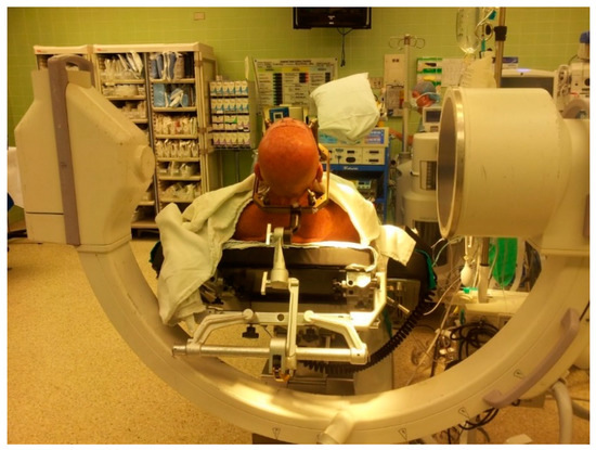 Position of the patient on the operating room table with the Leksell frame fixed to the table through a Mayfield adaptor and the C- arm positioned around the patient.