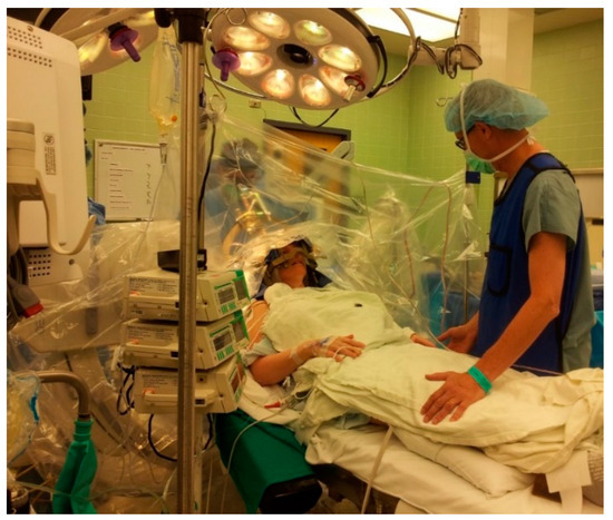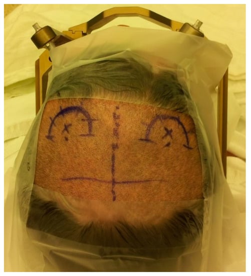In the operating room, the patient was placed on the operating table with a Leksell frame secured to the table using a Mayfield adapter. The C-arm was placed around the patient in order to use intraoperative fluoroscopy for electrode tracking and positioning (Figure 7). We used transparent sterile drapes to allow easier communication with the patient and observation of the patient’s symptoms during this awake procedure (Figure 8). Two semicircular incisions were made on both sides of the midline (Figure 9). Then we drilled two burr holes, one on each side, 1 cm anterior to the coronal suture and 2–3 cm lateral to the midline. We started the surgeries with the left side and then shifted to the right side.