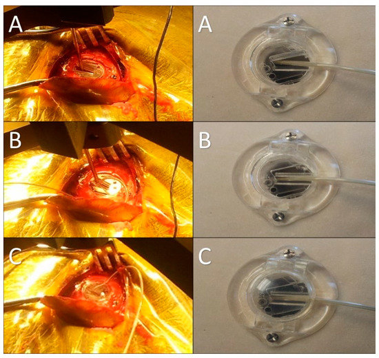Intraoperative pictures and corresponding model images showing the steps of electrode fixation using the Stimloc device. (A) A special locking piece placed onto the Stimloc base with the electrode passing through it; (B) the electrode is locked in place with this piece after removing the stylet and moving the electrode out of the cannula; (C) the final step of the electrode fixation: the Stimloc cap is placed and fixed over its base.