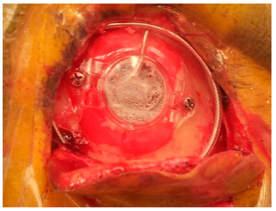 After identification of the STN borders and depth by the MER, we started high-frequency macrostimulation. The aim of the stimulation was to confirm the optimal target, which provided adequate control of the Parkinsonian symptoms (specifically tremors), without undesirable effects from stimulation below 4 volts. Once we reached our desired target, we removed the microelectrode and replaced it with a standard four-contact (0–3) deep brain stimulation electrode (Medtronic DBS lead 3389). Generally, we placed the deepest electrode contact (0) at or just beyond the target point. We repeated the testing using this electrode in order to confirm the reproducibility of the effects. We locked the electrode in place using a Stimloc device (Medtronic, Minneapolis, MN, USA) (Figure 12). The excess of the electrode was coiled around the burr hole to create a strain relief loop (Figure 13). Then the same procedure was repeated on the right side.