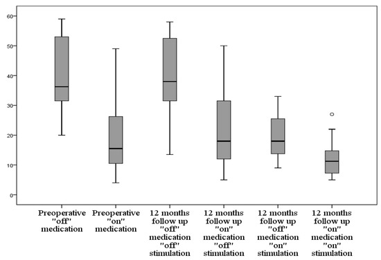 The “off” medication “off” stimulation score at one year decreased by a mean of 0.4 (1%) compared to the preoperative “off” medication score. This change was found to be non-significant (p = 0.452). The “on” medication “off” stimulation at one year increased compared to the preoperative “on” score by a mean of 1.6 (8.3%) with p = 0.13.