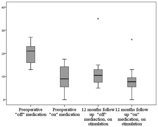 We did not find a correlation between the preoperative improvement in the UPDRS III score, bradykinesia, and axial score after levodopa intake and the one-year follow-up values. A positive correlation was found between the preoperative improvement in tremors score (r = 0.563, p = 0.010) and rigidity score (r = 0.485, p = 0.030) with the postoperative tremors and rigidity, respectively.