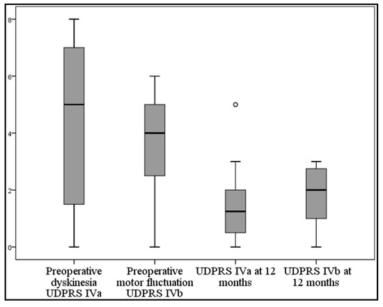 Graph showing the preoperative and 12-month follow-up of UPDRS IVa and IVb; UPDRS Unified Parkinson’s Disease Rating Scale.