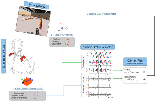 The purpose of the Kalman filter is to estimate the cursor’s state at every instant in time, based on the body-motion observations. The Kalman model assumes the state to be linearly related to the future state (next time step) by a stochastic linear function (Figure 1; Equation (3)). The model also assumes that the observation is linearly related to the state at each instant in time by another stochastic linear function (Figure 1; Equation (4)). Through these two assumptions, the calibration data from the cursor and the IMUs can be used to estimate the model’s matrices via least squares (for details, see [25,26,27]). After the model’s parameters have been estimated, the model encodes the body observation and cursor propagation, and participants can move their shoulders to control the 2D cursor on the screen. Participants were allowed to familiarize themselves with the control of the BMI before beginning the experiment (Figure 1). If participants had trouble controlling the map or if they did not feel comfortable with it, the calibration procedure was repeated.