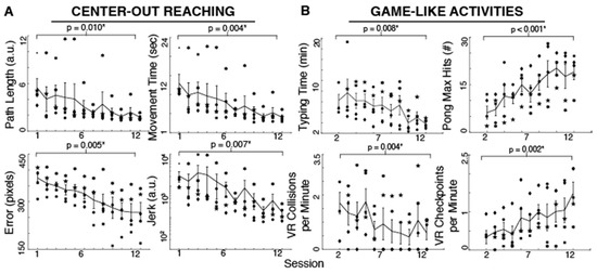 Although subjects’ performance in their last session of center-out reaching and game-like activities was better than the first session, it seemed that the performance was still improving during the last sessions. This indicates that participants had not yet plateaued in their performance and could reach even higher levels of control with the BMI.