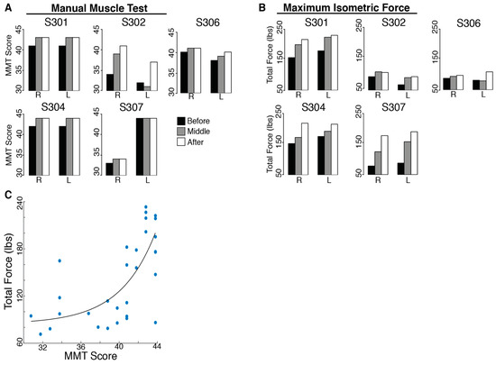 Upper-body ability of people with spinal cord injury performing 12 weeks of BMI training. (A) The total Manual Muscle Test (MMT) scores for the right (R) and left (L) shoulders before (black), in the middle (grey) and after (white) training; (B) The total maximum isometric force for the right and left shoulders and arms before, in the middle and after training; (C) Correlation between the MMT total score (x axis) and the total force score (y axis) measured with a hand-held force sensor (sum of the forces exerted by one shoulder and arm in the eight tested movements).
