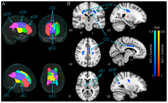 Regions showing lower fractional anisotropy (FA) in spinal cord injury (SCI) subjects compared to controls. (A) Brain regions associated with motor function used to perform tract-based spatial statistics (TBSS) and ROI analyses; (B) TBSS results. Regions showing significantly higher (red-yellow) and lower (blue-light blue) FA values in SCI versus control subjects overlaid over the standard Montreal Neurological Institute (MNI)152 T1-weighted anatomical scan (p < 0.05, uncorrected). The location of each slice in Montreal Neurological Institute space is shown at the lower left section. a-s-pCR, anterior, superior and posterior corona radiata; CG, cingulum; g-bCC, genu and body of corpus callosum; a-pIC, anterior and posterior limbs of internal capsule.
