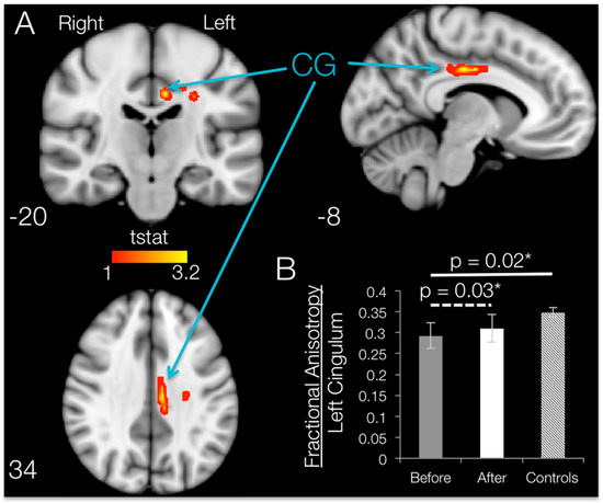 ROI analysis on the damaged regions of interest (identified by using the Johns Hopkins University JHU white-matter atlas) revealed that the only ROI that showed a significant increase in FA following training was the cingulum, with an average increase of 6.02% (tCG = 2.58, p = 0.031; Figure 6B). Although TBSS results show increases in FA in some of the other ROIs, whole-ROI increases for the left body of the corpus callosum (tbCC = 1.46, p = 0.109, 0.77% increase), the superior corona radiata (tsCR = 0.147, p = 0.445, 0.19% increase) and the posterior corona radiata (tpCR = 0.836, p = 0.225, 1.14% increase) were not significant. No ROI had significant changes in MD, RD or AD values, and no brain area showed significant increases in FA from TBSS or ROI analyses.