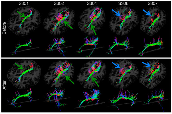 Tractography analysis of left cingulum for SCI subjects before and after BMI training. Tracts passing through the areas with significant (p < 0.05) increases in FA within the left-hemisphere cingulum are shown for each subject before (top), and after (bottom) training. Arrows highlight areas with an apparent increase in anterior-posterior (green) or inter-hemispheric (blue) tracts.