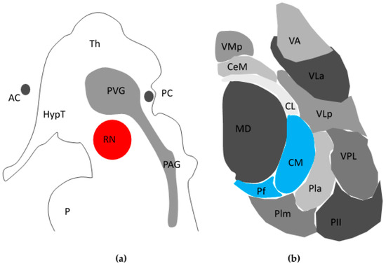 Schematic view of peri-aqueductal grey/Periventricular grey (PAG/PVG) and centromedian intralaminar parafasciular complex (CMPf). (a) Sagittal cross-sectional schema of PVG/PAG within midbrain/diencephalon; (b) Axial cross section of left thalamus demonstrating CMPf (blue) adapted from Weigel and Kraus, 2004 [30]. AC: Anterior Commissure; HypT: Hypothalamus; RN: Red Nucleus; PC: Posterior Commissure; Th: Thalamus; P: Pons; MD: Mediodorsal nucleus; VMp: Ventral Posteromedial nucleus; CeM: Central Medial nucleus; CL: Centrolateral; Plm: Medial nucleus of Pulvinar; Pll: Lateral nucleus of Pulvinar; Pla: Anterior nucleus of Pulvinar; VPL: Ventral Posterior Lateral nucleus; VLp: Ventrolateral Posterior nucleus; VLa: Ventrolateral Anterior nucleus; VA: Ventral Anterior nucleus.