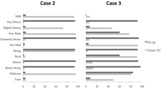Pre-operative and post-operative Descriptor Differential Scale (DDS) [43] for Cases 2 and 3. Pre-operative and post-operative DDS measurements were performed for Case 2 and Case 3. Patients were asked to mark along each line the extent to which the description applies to their symptoms between 0 and 100. Single electrode dual target dual stimulation at 3 years follow-up decreased the severity of pain consistently in patients 2 and 3 compared to pre-operative assessments. Post-operative DDS measurements were not available for Case 1.