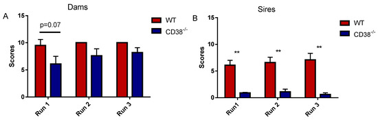 The pup retrieval scores of CD38+/+ Wild-type(WT) or CD38−/− dams (A) and sires (B) in three trials. Ten experiments were conducted for each test. The two-tailed Student t-test was performed for each trial for dams (p > 0.05 for each comparison between genotypes) and for sires (** p < 0.01 for each comparison).