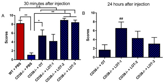 The effects of the LOTs on the investigation time were examined. As shown in Figure 3B, 30 min after treatment with LOT-1, LOT-2 and LOT-3, CD38−/− males displayed a decrease in interaction time with the repeated meetings: from 36 ± 3.7 s to 27 ± 1.4 s (n = 6) for LOT-1; from 39 ± 3.3 s to 32 ± 3.2 s (n = 5) for LOT-2; and from 44 ± 2.5 s to 28 ± 1.9 s (n = 5) for LOT-3. Significant increases in investigation time were observed at the 5th meeting with a new male from the 4th meeting with a familiar male: from 27 ± 1.4 to 36 ± 3.3 s (n = 6) for LOT-1; from 32 ± 3.2 to 36 ± 4.0 s (n = 5) for LOT-2; and from 28 ± 1.9 to 42 ± 6.0 s (n = 5) for LOT-3.