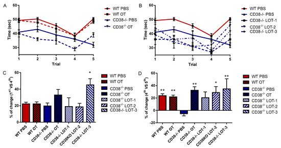 The average decrease following the repeated meetings from the first to the 4th meeting is illustrated in Figure 3C. The decrease was approximately 20%, except for the case of CD38−/− males treated with LOT-3. A one-way ANOVA resulted showed a significant difference: F6,49 = 2.779, p = 0.0209. Bonferroni’s post hoc tests revealed a significant difference between CD38−/− mice treated with PBS (20 ± 3.7%, n = 15) and with LOT-3 (45 ± 7.5%, p = 0.0197, n = 5).