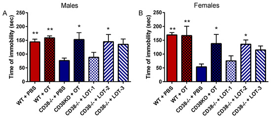 The tail suspension test is commonly used for observation of depression-like behavior. Interestingly, we discovered a shorter duration of immobility in both female and male CD38−/− mice than in CD38+/+ mice. This may not be surprising because CD38−/− mice have been shown to be hyperactive [41,52]. Recovery to the control levels were observed following OT and LOT-2 administration and, slightly, by LOT-3. As expected, no recovery was observed by LOT-1 during the short period after injection. Future experiments should investigate this after 24 h.