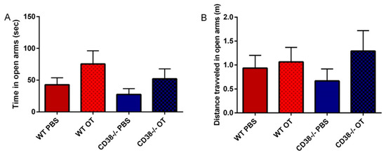 In the elevated plus maze task, both CD38+/+ and CD38−/− male mice treated with PBS demonstrated a similar time spent in the open arms (Figure 5A) and distance travelled (Figure 5B): 42.8 ± 10.9 s and 0.93 ± 0.26 m (n = 10), respectively, for the wild-type; 27.5 ± 9.1 s and 0.66 ± 0.25 m (n = 5) for CD38−/− mice, respectively. OT slightly increased the time spent and distance travelled in the open arms in both genotypes without statistical significance. A one-way ANOVA did not indicate significance in time spent in open arms (F3,21 = 0.542, p = 0.23) nor distance travelled in the open arms (F3,21 = 0.557, p = 0.649). These data indicate that CD38−/− mice display less anxiety-like behavior, as has been shown previously [8]. We did not further test the LOTs for this parameter.