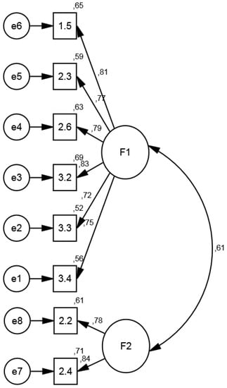 This index should be calculated for each construct, and the obtained value should be equal to or higher than 0.70. The higher the construct reliability, the greater the internal consistency of its indicators. Therefore, the indicator of CR for the first factor was very adequate, and that of the second factor was within acceptable margins. We calculated AVE by applying the following formula [50]. As the indicators become more representative of the latent construct, the value of the variance increases, and the recommended value is ≥0.50. Hence, the AVE indicators were within the recommended range.