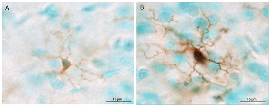 Depiction of the morphological differences between ramified (unchallenged) (A) and primed (B) microglial cells. In the current study, microglia were classified as primed when the cell body was large and completely, darkly stained and processes were darkly stained and thick.