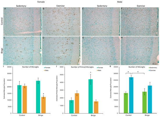 The effects of binge alcohol and exercise on microglia in the medial prefrontal cortex (mPFC) of females (A–D) and males (E–H); images of Iba1 staining in the mPFC captured at 10×. Binged males had fewer microglia in the mPFC compared to all other groups (I). There was a binge-induced suppression of exercise-induced microglial plasticity (K), as exercise increased microglia numbers in control, but not binged animals. For morphologically primed microglia (J), binged females had more compared to all other groups. * p < 0.05.