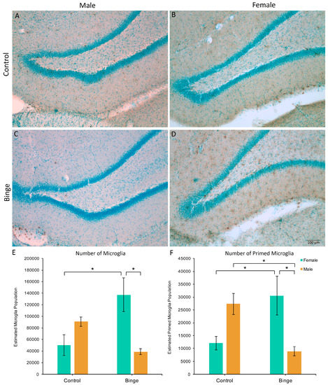 The effects of binge alcohol and exercise on microglia in the hippocampus of males (A,C) and females (B,D). Binge alcohol increased the number of microglia in females compared to female controls and binged males (E). Binge alcohol increased the number of morphologically primed microglia in females, but decreased it in males (F). * p < 0.05.
