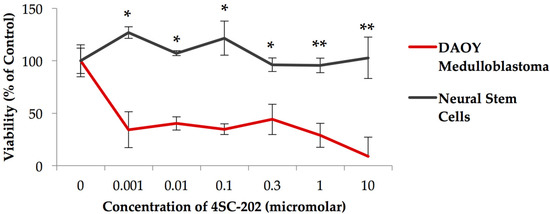 Exposure of the medulloblastoma cell line to 4SC-202 for 72 h significantly reduces viability at concentrations ranging from 0.001–10 µM (Figure 1), but does not significantly affect the growth of the control NSCs. Concentrations ranging from 0.001–0.3 µM were significantly different from control-treated cells, with a paired two-tailed t test, p < 0.05. Concentrations ranging from 1–10 µM were significantly different from control-treated cells, with a paired two-tailed t test, p < 0.001.
