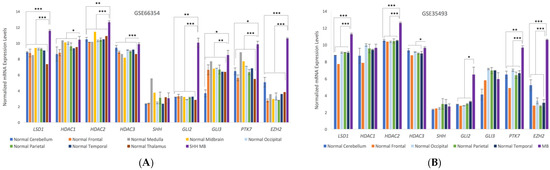 Normalized mRNA expression values from Affymetrix HG-U133plus2 chips were extracted from the Gene Expression Omnibus (GEO) repository, dataset numbers GSE66354 and GSE35493 [11,12]. For GSE66354, gene expression data from eight SHH MBs, two normal cerebellums, three normal frontal lobes, one normal medulla, one normal midbrain, two normal occipital lobes, two normal parietal lobes, one normal temporal lobe, and one thalamus (n = 13 normal brain samples) were used in the analysis. For GSE35493, gene expression data from 17 MBs, 2 normal cerebellums, 1 normal frontal lobe, 2 normal temporal lobes, 2 normal occipital lobes, and 2 normal parietal lobes (n = 9 normal brain samples) were used. Each gene of interest in these datasets was identified by a single Affymetrix probe set ID except EZH2 and HDAC2, which are each identified by two probe set IDs. EZH2 gene expression was determined based on the results from probe 203358_s_at and HDAC2 from probe 201833_at. Error is represented as the standard error of the mean (SEM). Significance was determined using Linear Models for Microarray Data (LIMMA) package in R Bioconductor through GEO2R between MB and normal cerebellum as well as between MB and all normal brain samples [13]. P values were adjusted using the Benjamini and Hochberg procedure [14].