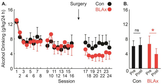 Alcohol drinking pre- and post-surgery. (A) Mean + SEM alcohol drinking (g/kg/24 h) for each voluntary access session is shown for control (Con—black) and mean − SEM for BLAx rats (red). Time of surgery is indicated by an arrow. (B) Mean + SEM alcohol drinking (g/kg/24 h) for the eight sessions prior to surgery (pre) and the eight sessions following surgery (post). Asterisks indicate the significance of the two-tailed, paired samples t-test (p < 0.05). NS indicates non-significance of the two-tailed, paired samples t-test (p > 0.1).