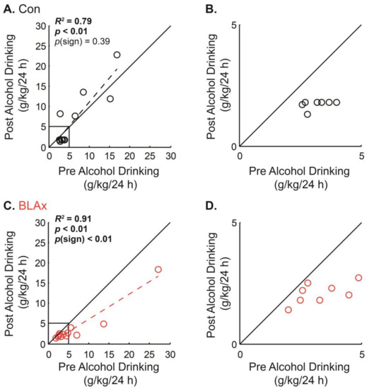 Relationship between alcohol drinking pre- and post-surgery. (A) Scatter plot compares pre-surgery drinking (mean of eight sessions prior to surgery) and post-surgery drinking (mean of eight sessions following surgery) for all control rats (Con). (B) Same data but zoomed in to visualize low drinking individuals. (C) Scatter plot compares pre-surgery drinking (mean of eight sessions prior to surgery) and post-surgery drinking (mean of eight sessions following surgery) for all BLAx rats. (D) Same data but zoomed in to visualize low drinking individuals. For each group, the square of Pearson’s correlation coefficient (R2) and its associated p value are reported. The p-value for a sign test comparing alcohol drinking (post – pre) to zero is reported. Note: scatter data points fully correspond to pre- and post-surgery alcohol drinking, shown in Figure 2B.