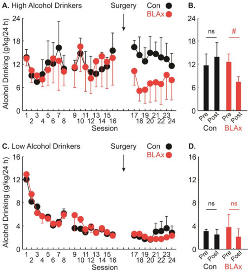 Alcohol drinking pre- and post-surgery for high and low drinkers. (A) Mean + SEM alcohol drinking (g/kg/24 h) for each voluntary access session is shown for the high drinking control (Con indicated in black) and mean − SEM shown for high drinking BLAx rats (red). The time of surgery is indicated by an arrow. (B) Mean + SEM alcohol drinking (g/kg/24 h) for the eight sessions prior to surgery (pre) and the eight sessions following surgery (post). (C) Mean + SEM alcohol drinking (g/kg/24 h) for each voluntary access session is shown for low drinking controls (Con indicated in black) and mean − SEM for low drinking BLAx rats (red). The time of surgery is indicated by an arrow. (D) Mean + SEM alcohol drinking (g/kg/24 h) for the eight sessions prior to surgery (pre) and the eight sessions following surgery (post). Pound sign indicates two-tailed, paired samples t-test (p = 0.09). NS indicates non-significance of the paired samples t-test (p > 0.1). Note: data are those exactly shown in Figure 2 (n = 12 per group), only separated with respect to high (n = 4 per group) or low (n = 8 per group) adolescent drinking.