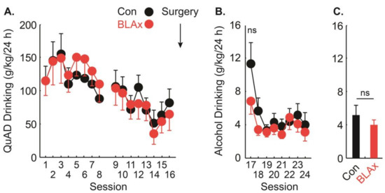 QuAD drinking pre-surgery and alcohol drinking post-surgery. (A) Mean ± SEM QuAD drinking (g/kg/24 h) for each voluntary access session prior to surgery is shown for controls (Con indicated in black) and BLAx rats (BLAx indicated in red). The time of surgery is indicated by an arrow. (B) Mean ± SEM alcohol drinking (g/kg/24 h) for each voluntary access session following surgery is shown for controls and BLAx rats. (C) Mean ± SEM alcohol drinking (g/kg/24 h) for the eight sessions following surgery (post). NS indicates non-significance of the two-tailed, independent samples t-test (p > 0.1).