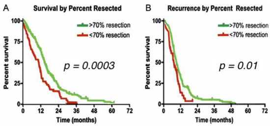 Kaplan Meyer curves of extent of resection in high grade gliomas (HGG). (A) The median survival for patients with >70% tumor resection was 14.4 months compared with 10.5 months for patients with ≤70% resection (p = 0.0003); (B) The median percent free survival for patients with >70% tumor resection was 9.0 months compared with 7.1 months for patients with ≤70% resection (p = 0.01). (Reproduced from Chaichana et al. [7]).