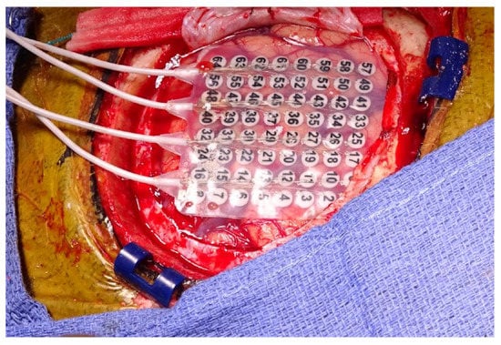 Awake Craniotomy: Awake craniotomy (AC) is a useful anesthetic and surgical technique that allows for the identification of eloquent areas in tumors involving cortical and subcortical regions, especially for tumors that would otherwise be considered inoperable [47,53,54,55,56,57]. There are cases during repeat awake craniotomy where the tumor can displace the eloquent areas due to brain plasticity; thus, the surgeon cannot rely on the magnetic resonance imaging (MRI) and the anatomy itself for the extent of resection [58]. For this reason, AC also permits the surgeon to monitor and rely on the functionality of patient while the patient is awake, and thereby increase the extent of resection. Cortical mapping of these areas (through a set of direct electrodes that stimulate or inhibit cortical functions) remains the optimal option to delineate the relationship of tumor to eloquent cortex in order to avoid damage of tissue that can compromise language or movement skills in patients (Figure 2).