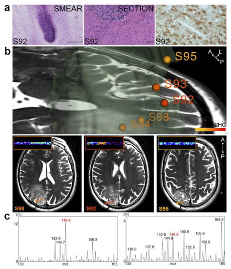 Intraoperative mass spectrometry of an onco-metabolite to guide brain tumor resection. (a) H & E-stained smear (Left), frozen tissue section (Center), and immunohistochemistry using an IDH1 R132H point mutation-specific antibody in an oligoastrocytoma grade III samples; (b) 3D tumor volume representation showing normalized 2-hydroxyglutarate (2-HG) signal represented with a warm color scale (lowest (yellow) to highest (red)); (c) Negative ion mode DESI mass spectra obtained from a smear (Left) and a section from an oligoastrocytoma grade III (Right). Used with permission from Santagata et al. [82].