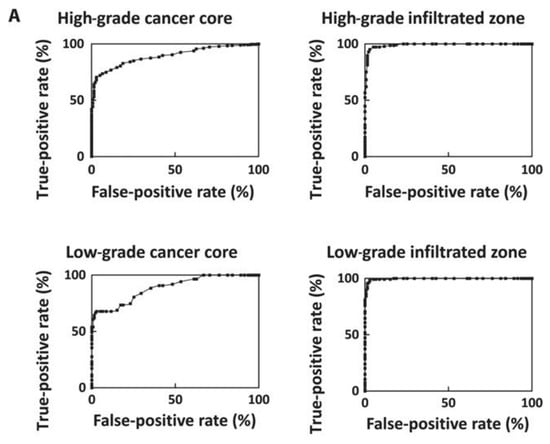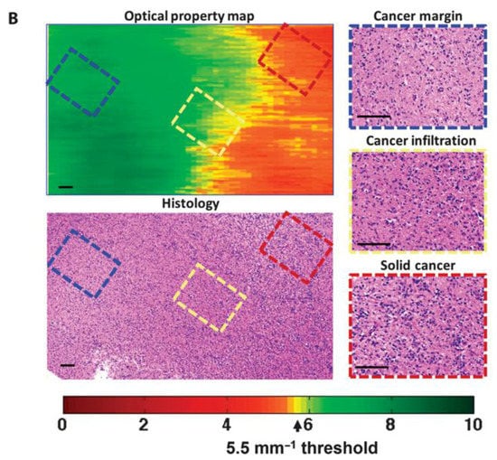 For brain cancer specifically, in an ex vivo model, OCT provided high-quality two-dimensional imaging in non-cancer and cancer tissues, with an optical attenuation values of 9% vs. 33% in non-cancer and cancer samples, respectively [85]. Using a different set of glioma samples, the researchers found that OCT showed a specificity of 50–70% and a sensitivity of 40–100% when differentiating HGG and LGG, with a correlation between histopathology and the color-coding map among samples [85].