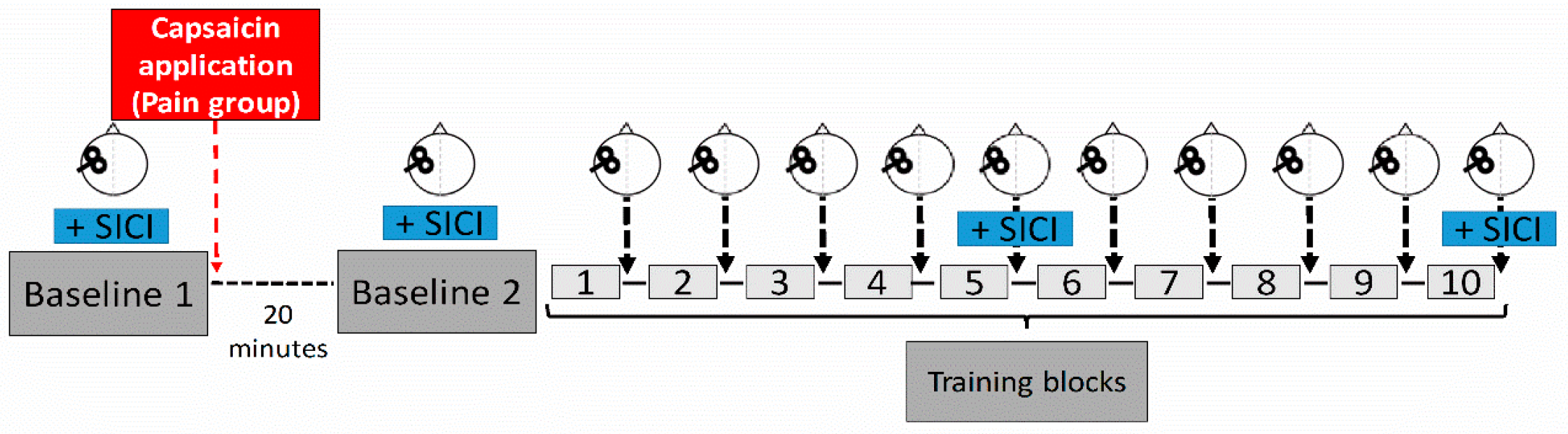 Experimental design. A subject performed ten training blocks of a novel motor task, and each block consisted of 15 successive trials. Corticospinal excitability was assessed using TMS at two baseline measurement periods (prior and after induction of pain (Pain group) or at similar time points (NoPain group), as well as after each training block. Short-interval cortical inhibition (SICI) was measured at the two baseline periods, and after blocks five and ten. The red arrow represents the time of capsaicin application for the Pain group. A wait period of 20 min was imposed on both groups between the two baseline measurements to enable pain levels to significantly increase.