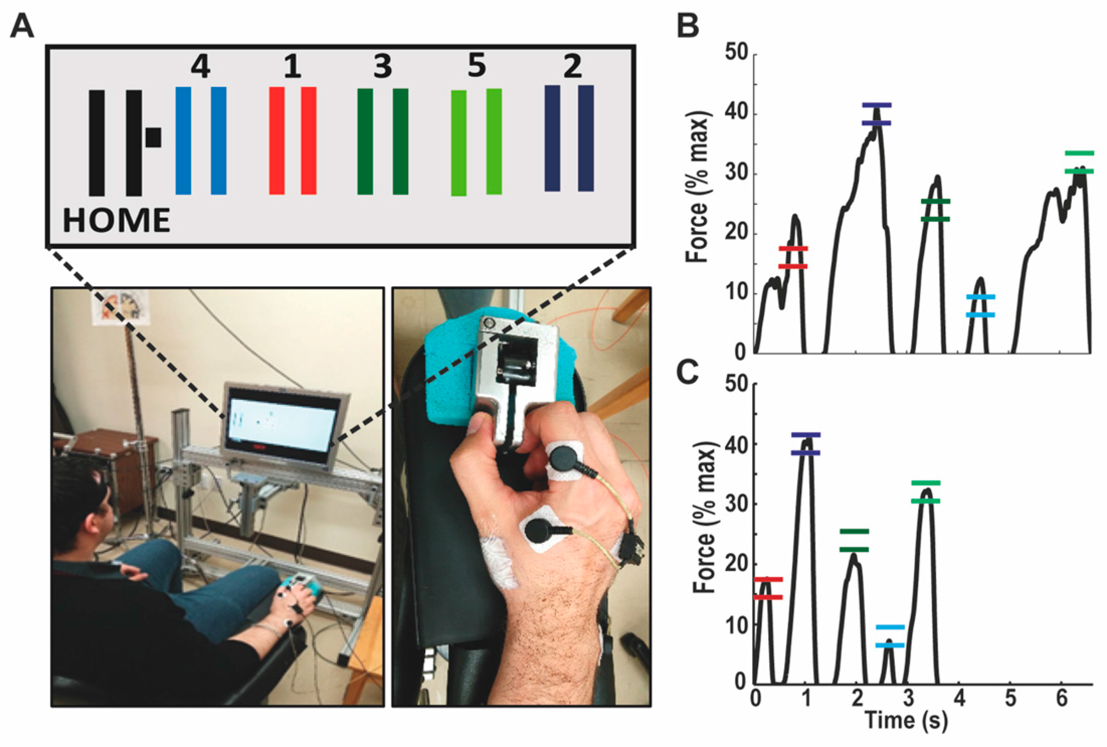 The motor task for which subjects were trained was a modified version of the sequential visual isometric pinch task, developed by Reis et al. [32] (see Figure 2). All subjects were naive to this task and they had to pinch a force transducer between their right thumb and index finger, in order to control the position of a cursor displayed on the computer screen in front of them. They were instructed to move the cursor as quickly and accurately as possible, from the Home position to the five gates that appeared one-by-one on the screen in a set sequence (the sequence was always Home-Gate 1-Home-Gate 2-Home-Gate 3-Home-Gate 4-Home-Gate 5-Home), and the gates were always positioned as depicted in Figure 2A, although they never appeared altogether on the screen. Returning to the Home position triggered the disappearance of the previous gate, as well as the appearance of the next one, even if the subject did not successfully reach the gate during the previous trial. The force needed to reach each gate was normalized according to the maximal voluntary force (MVF) of the subject, which was measured at the beginning of the experiment (average of two trials). From the Home position, the increment in force needed to reach the center of each gate corresponded to 8% of MVF (hence, the center of the rightmost door corresponded to 40% MVF; Figure 2B,C), and the width of each gate corresponded to ±1.6% of MVF. Therefore, the visual gain was matched across subjects in terms of % of MVF, rather than in terms of absolute force. Subjects were given a short familiarization period with the dynamometer, in which they were allowed to reach two static gates that were not part of the trained sequence. Each subject then performed ten training blocks, each of which consisted of 15 sequences (one sequence = five gates). The 15 sequences were performed one after the other in a continuous manner, and subjects were instructed not to stop between each gate or each sequence, as they were required to complete the full block as fast as possible.