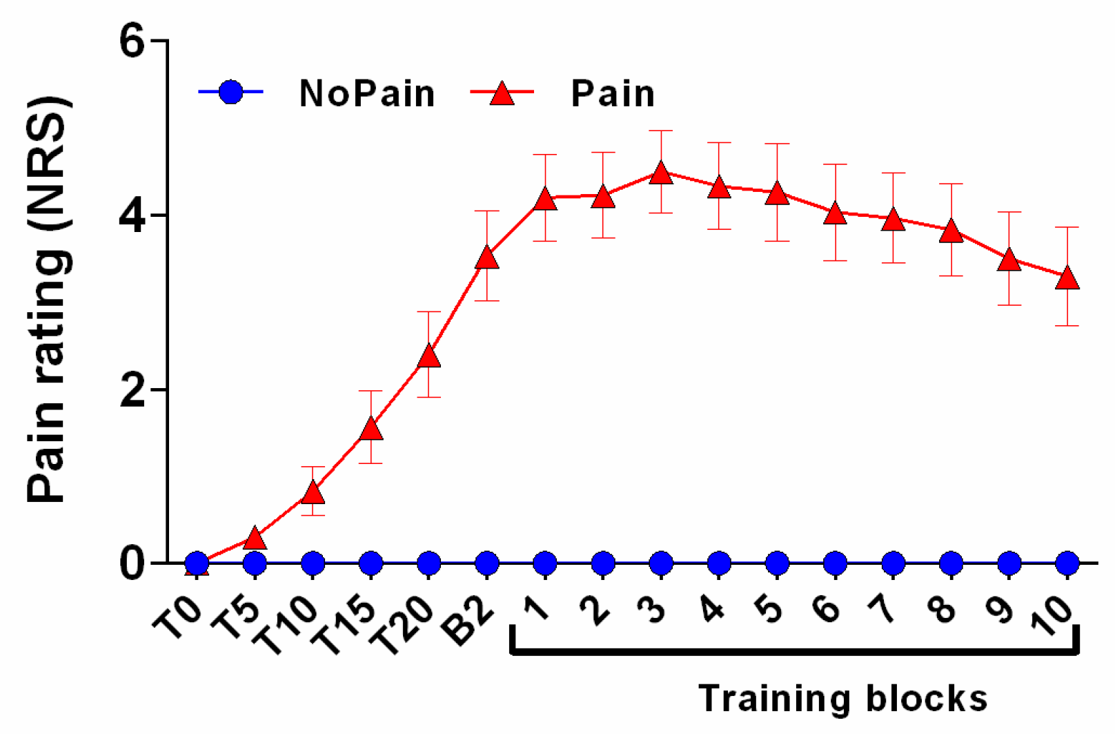 Time course of pain ratings. Subjects rated their pain on a numerical rating scale (NRS) immediately after capsaicin application and then every five minutes. The last measurement before training (B2) was taken right after the second baseline measurement, which corresponded to approximately 25 min after capsaicin application. NoPain group ratings are represented by blue circles and those of the Pain group as red triangles. Error bars represent the standard error of mean (SEM).