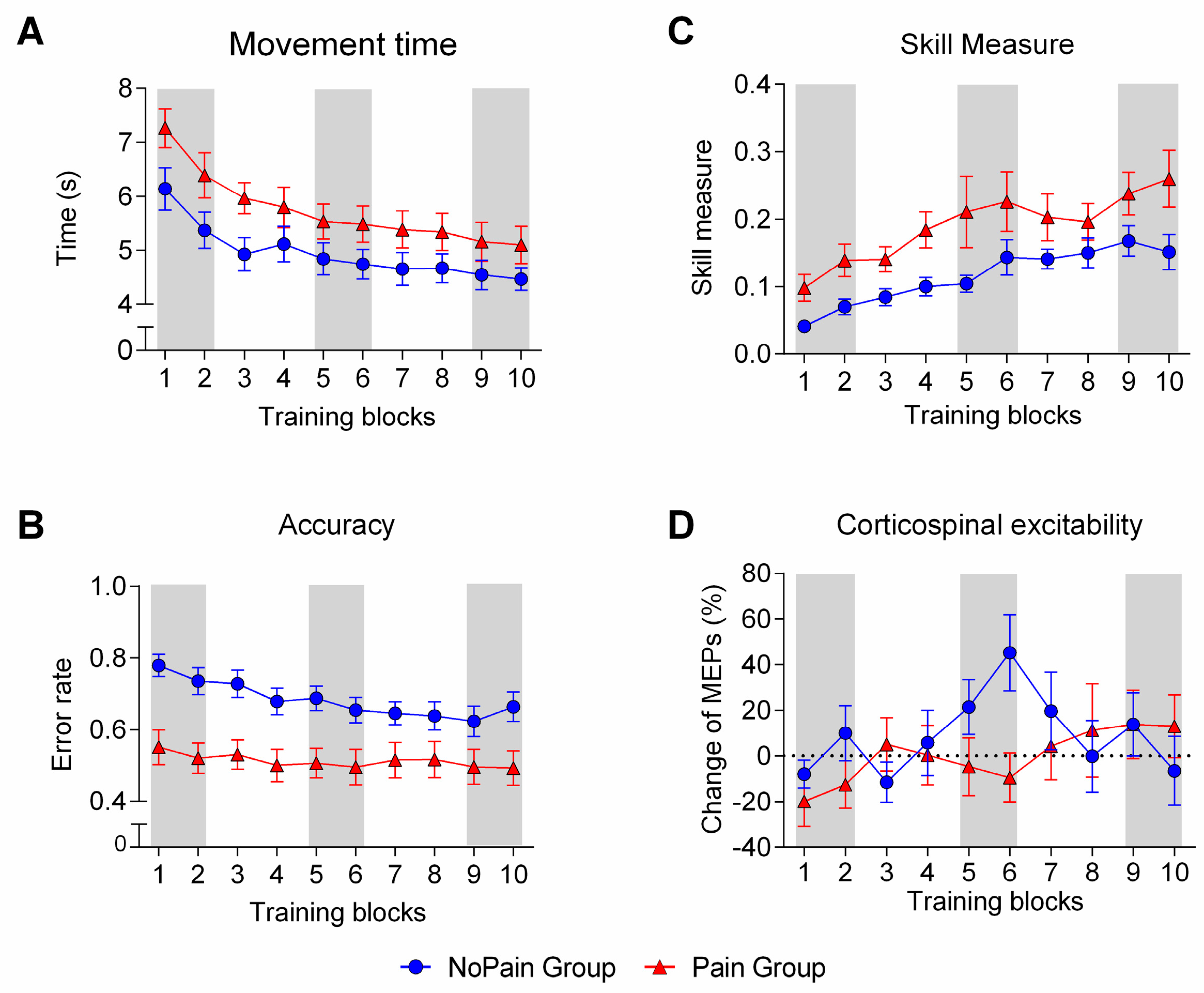 Changes in behavioral and neurophysiological variables over time for each group. (A) shows the time course of changes in Movement time (average time needed to perform a sequence); (B) presents the time course of changes in Accuracy (average error rate per block of 15 sequences); (C) depicts the time course of changes in Skill Measure (an index calculated to take into account the speed-accuracy trade-off); (D) illustrates the time course of changes in corticospinal excitability, measured with single pulse TMS. The NoPain group is represented by blue circles and the Pain group by red triangles. Shaded areas indicate the time periods that were used for statistical analysis: Early (training blocks 1 and 2), Mid (training blocks 5 and 6), and Late training (training blocks 9 and 10).