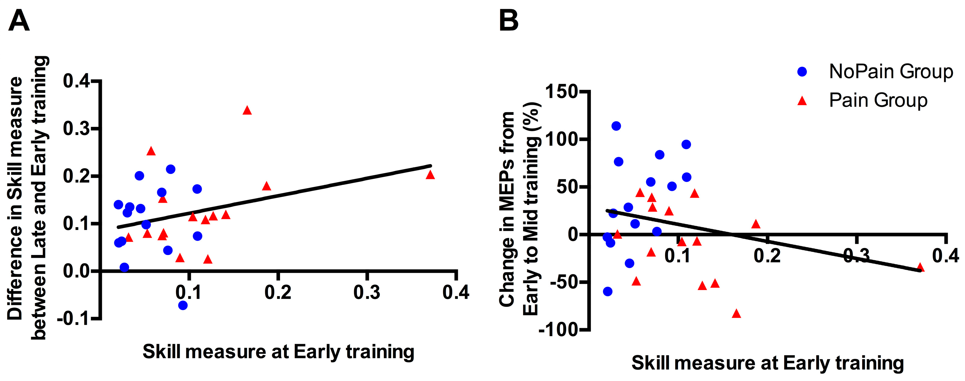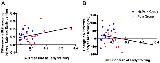 Association between Skill Measure during Early training and (A) improvement in Skill Measure from Early to Late training; (B) changes in motor evoked potential (MEP) amplitude (%) at Mid training relative to Early training. Blue circles represent subjects from the NoPain group and red triangles subjects from the Pain group. The regression lines have been fitted on data from both groups.