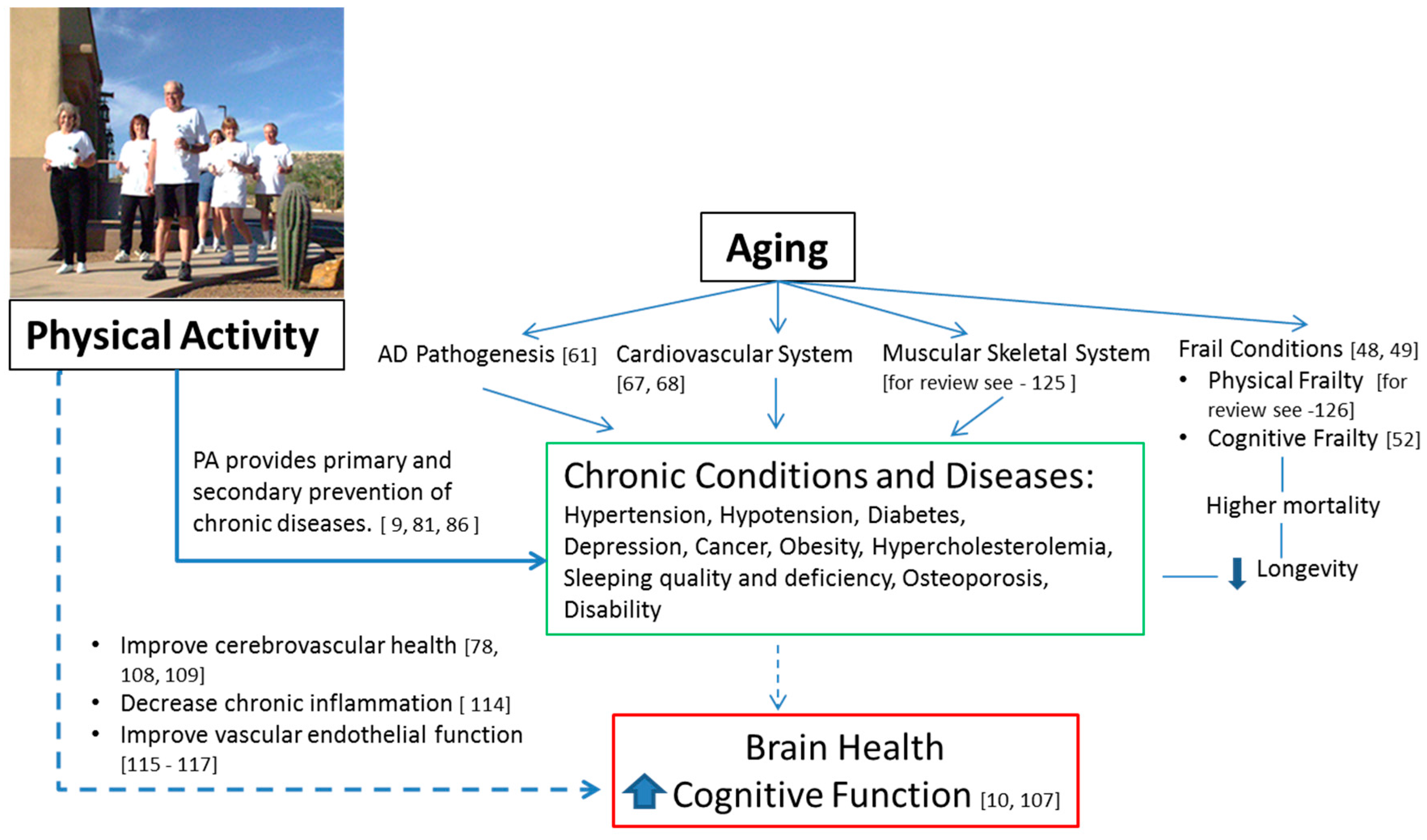 Several studies demonstrate the protective effect of PA on brain health, particularly by reducing the risk for the neurodegenerative dementia-causing diseases, AD and VaD, as well as their precursor, MCI. We have described potential direct and indirect mechanisms of this protective effect. More research is warranted to explore the relationships between PA and the aging brain. Other factors, including genetics, may affect the development of neurological disorders. However, in most cases, moderate PA is beneficial for both physical and mental health in older adults. Moderate-intensity aerobic exercise, resistance training, stretching, toning, and a range of motion exercises, may yield cognitive benefits in older adults. Although the exact mechanisms by which PA decreases the risk for dementia is not fully understood, PA should be encouraged [124], since it improves the quality of life for all older adults. The existing evidence shows that rates of dementia could be reduced, if people were physically active [10]. There is a possibility that PA may become the most important behavioral factor in facilitating healthy mental and physical aging (Figure 1). Current evidence supports PA’s short and long term cognitive benefits, regardless of age. Many mechanisms responsible for the PA’s protective effect against age-related cognitive impairment are still not fully understood.
