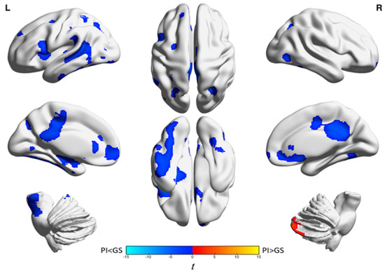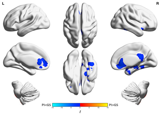 Two studies used ReHo to assess group differences (PI vs. GS) in brain activity during an fMRI resting-state scan [61,62]. One of these studies found that, compared to GS, patients with PI had lower homogeneity in the cingulate cortex and right cerebellum and higher regional homogeneity in the left fusiform gyrus [61]. A later study also found both higher and lower homogeneity in patients with PI compared to GS [62]. Specifically, compared to GS, patients with PI had lower homogeneity in the right middle cingulate and left fusiform gyrus and higher homogeneity in the left insula, right anterior cingulate, bilateral precentral gyrus, and left cuneus [62].