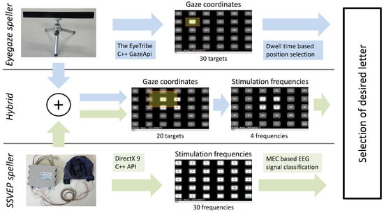 McCullagh et al. used an EyeTribe tracker (The Eye Tribe ApS, Copenhagen, Denmark) for gaze coordinates and EEG-data recorded with an Emotiv EPOC (Emotiv, San Francisco, CA, USA) for selection []. Their hybrid approach maintained information transfer rate (ITR) while accuracy and efficiency were increased. They also stated that the ITR of both, the tested eye tracking device and the hybrid were higher in comparison to a previous SSVEP-only system.