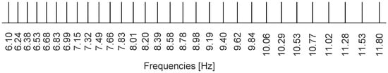 For the online spelling task with the SSVEP speller, approximated frequencies between 6.1 and 11.8 Hz (resolution < 0.2 Hz) were used. This interval was applied in previous studies as well, because it avoids overlapping in the 2-nd harmonics frequencies while still allowing a sufficient difference in-between []. As indicated in [], an equidistant stimuli set is not optimal, hence we selected 30 logarithmically spaced frequencies as displayed in Figure 2.