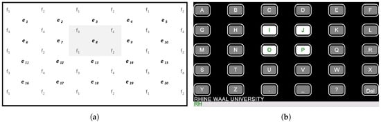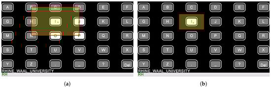 The here presented novel system allows hand-free control over a 30 target spelling interface using eye tracking for initial rough selection and the SSVEP technology for fine selection and activation. As we found during previous research, SSVEP systems with four or less targets allow high classification rates and offer control to a wide range of users []. Therefore, in this hybrid system we implemented only four simultaneously flickering stimuli. The letters are arranged in a 6 × 5 target matrix. If the user focuses on a specific letter, the area of the desired target is determined via eye tracking and a block of four letters starts flickering. As each of these four letters has a specific individual stimulation frequency, the system is able to classify a command. Gaze coordinates are tracked simultaneously in the background, allowing the user to switch to another block of letters if the initial area is false.
