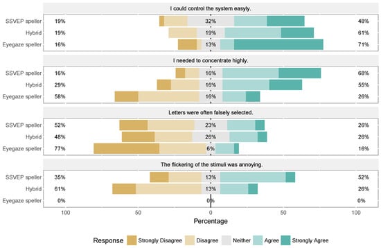 All in all, subjects gave generally positive feedback regarding the user friendliness of all tested systems (see Figure 5). Regarding the question if the system was easily controlled, the eye tracking system gathered the highest number of extreme answers (strong disagreement/agreement). The perceived level of control for the Hybrid was slightly better than for the SSVEP speller. Also, the majority of the subjects were more annoyed by the flickering of the SSVEP speller compared to the Hybrid. Fewer stimuli seemed generally to be less stressful for the user (see e.g., []). In addition, the time the subject had to look at a flickering target was larger for the SSVEP speller. Higher stimulation frequencies produce less visual fatigue and are more subtle than lower frequencies [,] , but their SSVEP amplitudes are significantly lower (see e.g., []). Especially for multi-target applications, BCI performance might drop to such an extent that reliable control is not possible. Because of this, we used lower frequencies in the tested applications.
