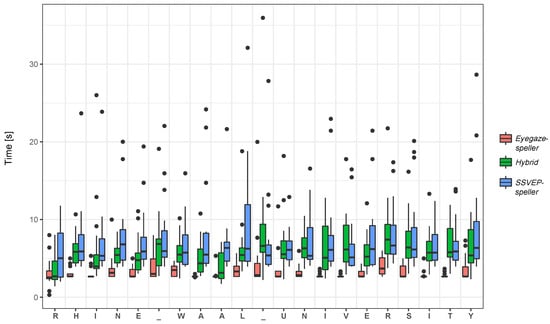Comparison of letter selection times (only correct selections, i.e., last selection in case of corrected spelling errors). The average classification time needed for every letter of the spelling phrase is provided for each of the tested systems: the steady-state visual evoked potentials based application (SSVEP speller), the here presented Hybrid application, and the eye tracking based application (Eyegaze speller).